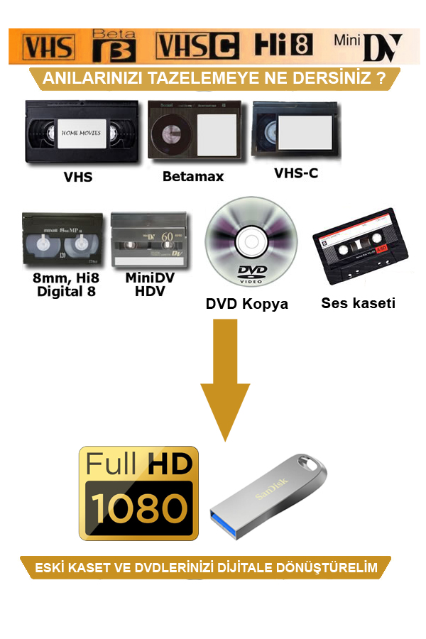 Aktarım: Profesyonel cihazlarla kasetleriniz HD kalitesinde dijital ortama aktarılır.